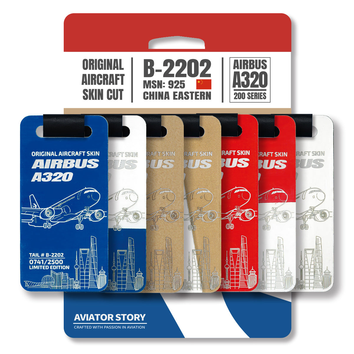 Various. This pack of China Eastern A320 original aircraft skin tags includes of 7 different color variants.