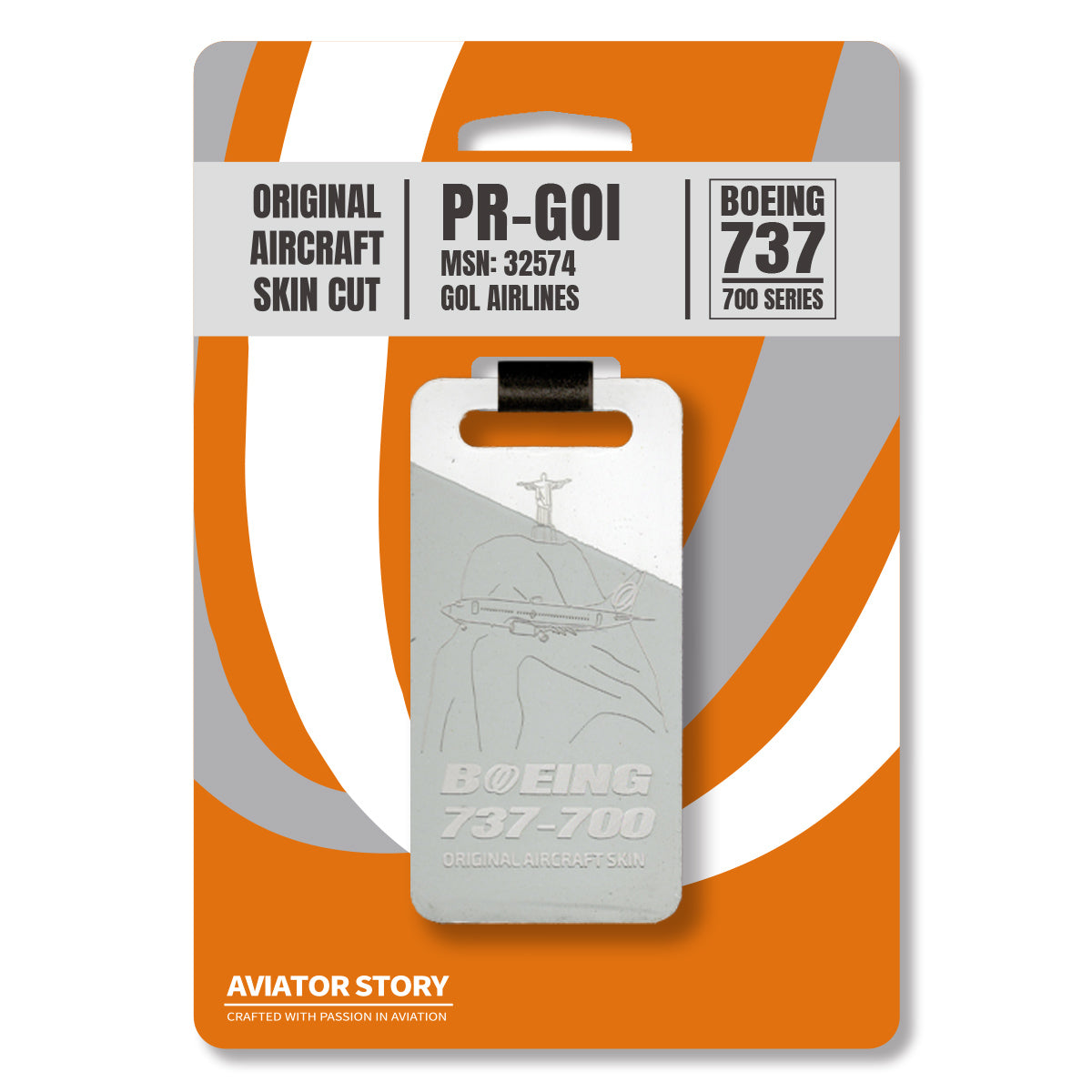 This Boeing 737-700 original plane tag was cut from the fuselage of Boeing 737 with registration number PR-GOI. Specifically, the section was cut from the front fuselage on the left side of the aircraft. We were able to preserve this section of the fuselage and manufacture the limited number of original aircraft skin tag that carries aviation history.